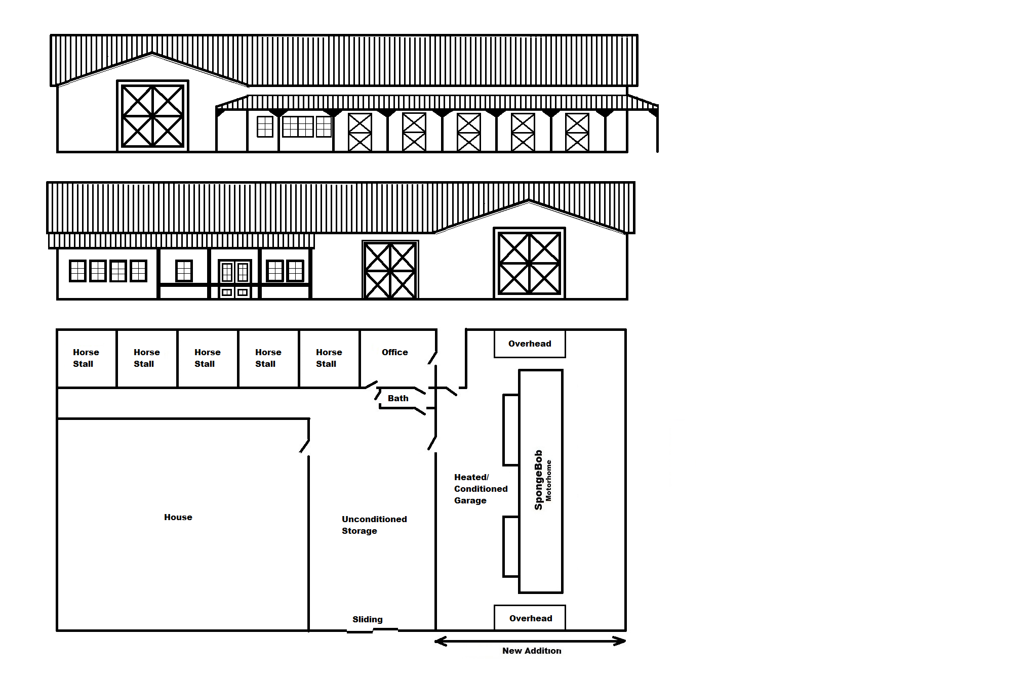 I'm adding an addition on to my Morton Building to house SpongeBob. The addition will add 37.5' to the length of the building and over 2000 sq ft of usable conditioned interior space. I'll have two overhead doors, 14'x14', to allow driving clear through the barn. The barn dimensions are currently 60'x75'; this will jump to 60'x112.5' when complete. I'm open to all suggestions: