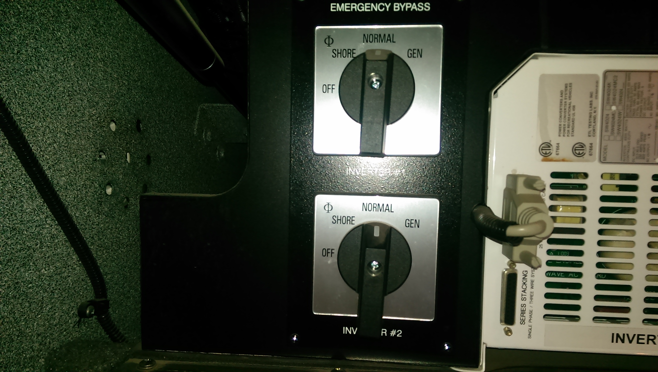(10-13-2014 14:14)Arcticdude Wrote: So what happens to SB (SpongeBob) if an inverter fails? Do they have a default of passing shore or genny thru so you're not stuck without power? Hi John, SB's got twin inverter bypass switches: Also, the power management system overlays onto the Square D circuit panel box and doesn't need to be functional to still enjoy the coach. If the system fails, I can very easily reach into the panel to disconnect each breakers' motor drive. It's as as simple as fiddling a small plastic push button latch on each CB. With the CB's internal motors disengaged the breaker box looks like any other and the fancy remote control with power management can spin its wheels forever with no effect. david brady, '02 Wanderlodge LXi 'Smokey' (Sold), '04 Prevost H3 Vantare 'SpongeBob' "I don't like being wrong, but I really hate being right" |