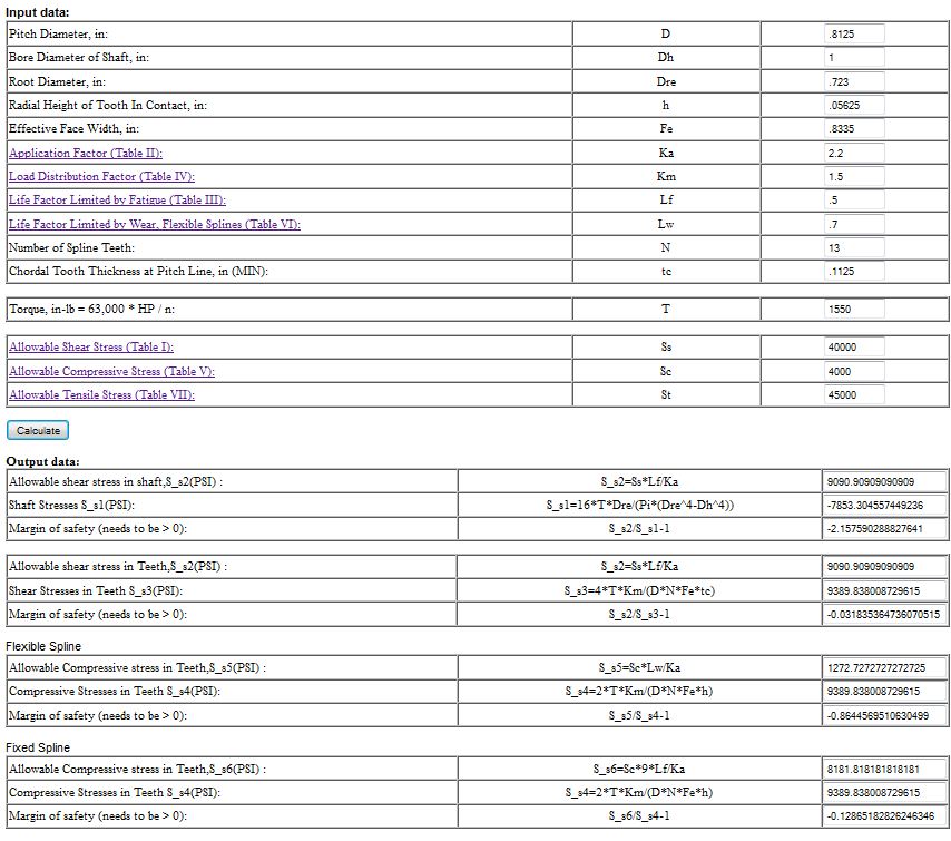 You can definitely rebuild the PTO. My local hydraulics tech very much supports this. I'm not so sure about the pump. You may want to get together with your local hydraulic shop to find out. I know when QCC builds their pumps they bed in on the first run. The gears actually slice into the body to get the fit QCC is looking for. If you put in a new pump shaft, which also has a gear milled into it, you may not achieve the needed tolerances. PTO yes, pump not so sure. Here's a study I did a long time ago on the SAE B to SAE BB upgrade: I've attached two outputs from a spreadsheet given to me by a gear professional. One is for the 7/8" shaft, (SAE B), the other for the 1" shaft, (SAE BB). If you look at the "shear stress in teeth" and "compressive stress in teeth" for the 'Fixed Spline' you'll see: 1) 'compressive stress in teeth' margin-of-safety of -0.129 for the 7/8" shaft and 0.349 for the 1" shaft, and 2) 'shear stress in teeth' margin-of-safety of -0.032 for the 7/8" shaft and 0.487 for the 1" shaft. My gear guy would like to see safety margins no less than 1.5x to 2.0x. The 7/8" shaft just isn't adequate. The 1" shaft is markedly better. I'd like to see even better but we can only accommodate an SAE BB upgrade. david brady, '02 Wanderlodge LXi 'Smokey' (Sold), '04 Prevost H3 Vantare 'SpongeBob' "I don't like being wrong, but I really hate being right" |