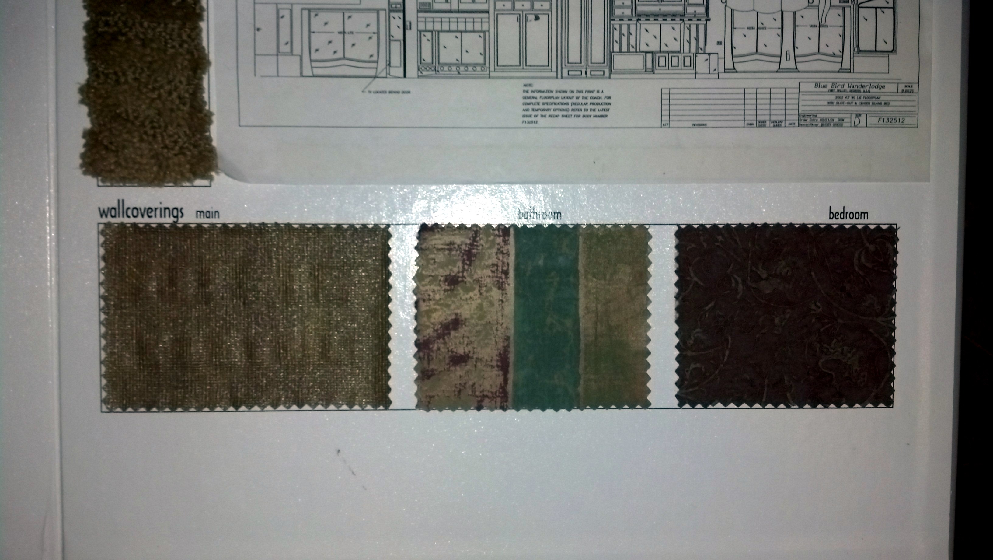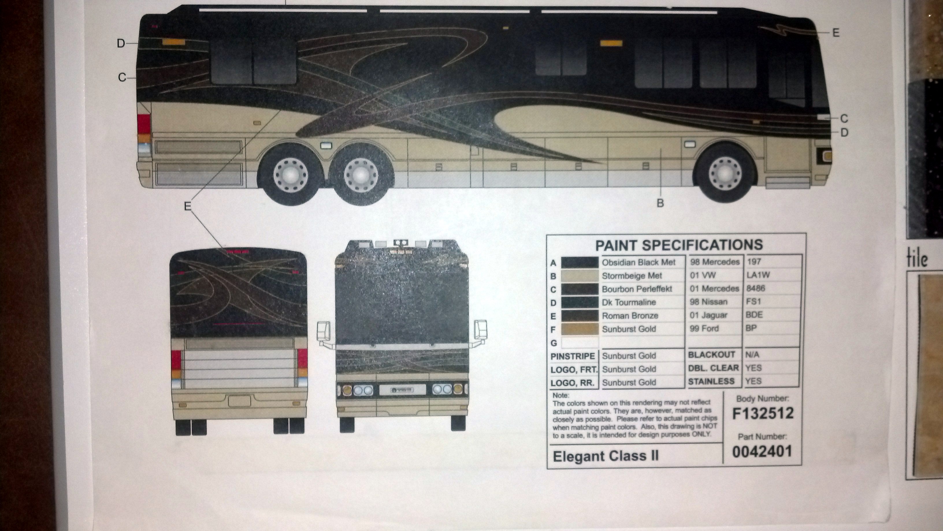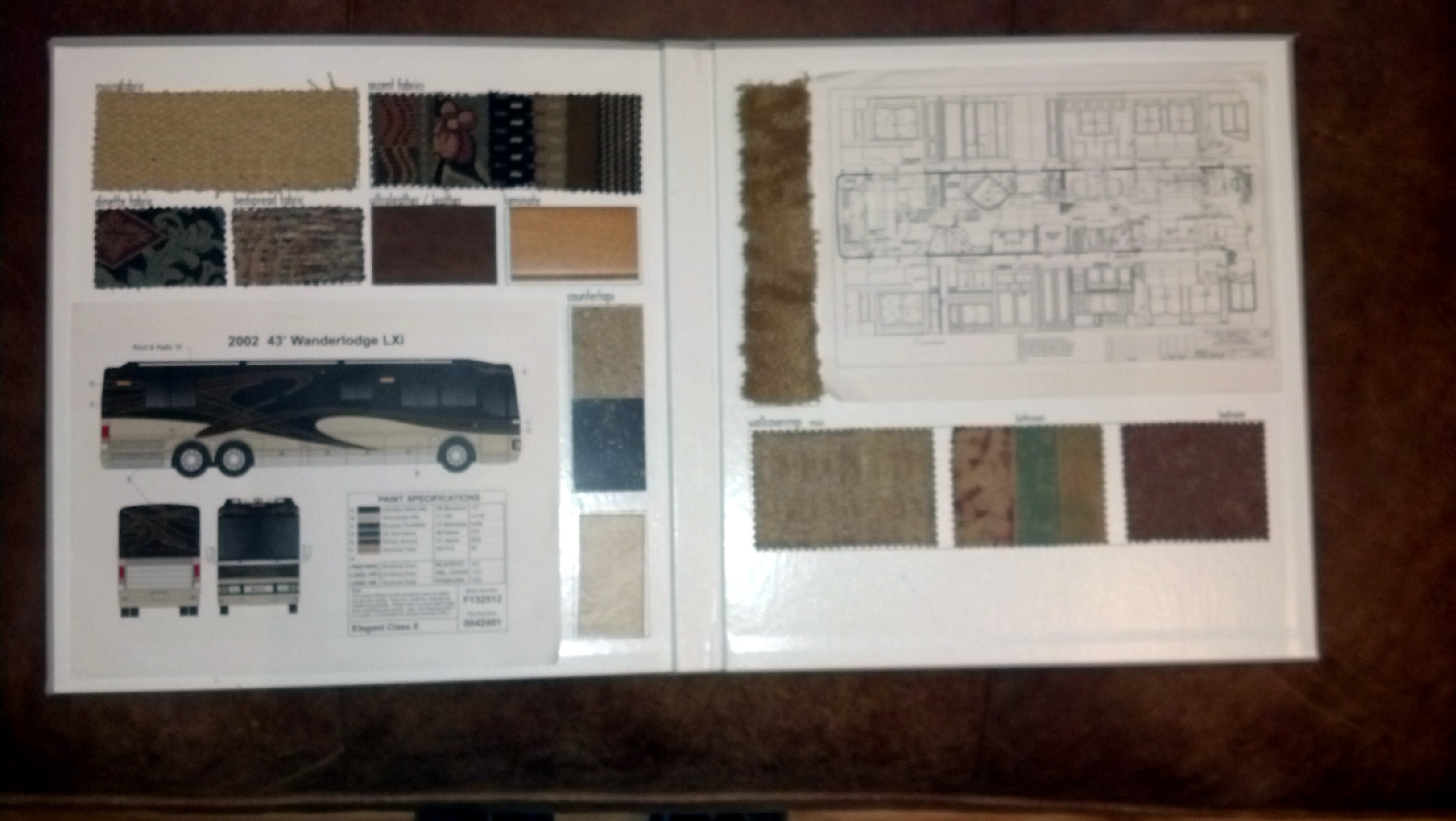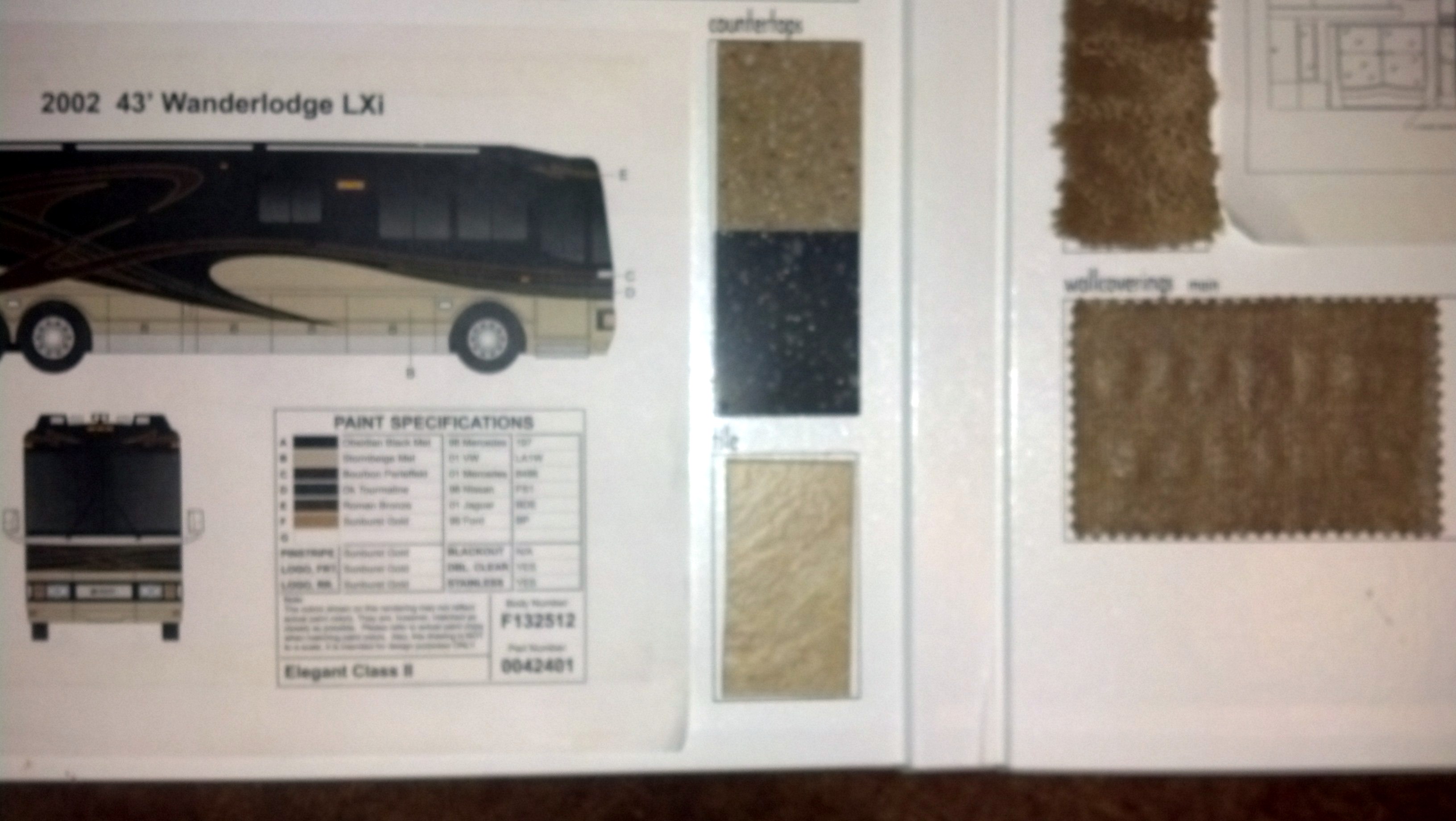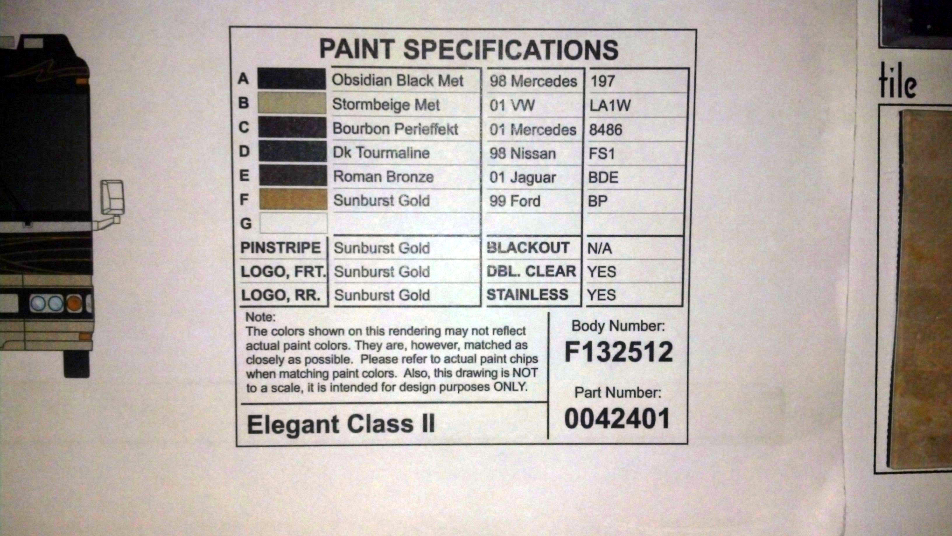 When I bought my coach I got a very nice 16" x 16" Blue Bird Wanderlodge embossed booklet containing the floorplan, samples of all the textures, flooring and fabrics used in the interior, and codes for all the exterior paints (as shown in the last attached pic). If you don't have it Parliament Coach might but you may have to purchase a copy of your coach records from them to get it. I'm not aware of the paint codes being attached to the bus body at any place.