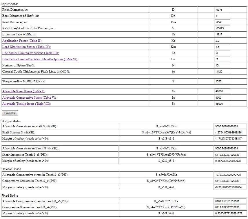 You can definitely rebuild the PTO. My local hydraulics tech very much supports this. I'm not so sure about the pump. You may want to get together with your local hydraulic shop to find out. I know when QCC builds their pumps they bed in on the first run. The gears actually slice into the body to get the fit QCC is looking for. If you put in a new pump shaft, which also has a gear milled into it, you may not achieve the needed tolerances. PTO yes, pump not so sure. Here's a study I did a long time ago on the SAE B to SAE BB upgrade: I've attached two outputs from a spreadsheet given to me by a gear professional. One is for the 7/8" shaft, (SAE B), the other for the 1" shaft, (SAE BB). If you look at the "shear stress in teeth" and "compressive stress in teeth" for the 'Fixed Spline' you'll see: 1) 'compressive stress in teeth' margin-of-safety of -0.129 for the 7/8" shaft and 0.349 for the 1" shaft, and 2) 'shear stress in teeth' margin-of-safety of -0.032 for the 7/8" shaft and 0.487 for the 1" shaft. My gear guy would like to see safety margins no less than 1.5x to 2.0x. The 7/8" shaft just isn't adequate. The 1" shaft is markedly better. I'd like to see even better but we can only accommodate an SAE BB upgrade. david brady, '02 Wanderlodge LXi 'Smokey' (Sold), '04 Prevost H3 Vantare 'SpongeBob' "I don't like being wrong, but I really hate being right" |