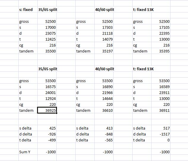 I have six scenarios. You can see going across the top row we have a fixed GVW of 52500. The first set of numbers fixes the steer axle at 17000 lbs. Moving to the right we see the effect on the steer axle of adjusting the tag/drive ratio to .4/.6, finally moving to the far right we see the effect on the steer axle by capping the tag to 13K. Moving down the columns the only thing changed is the addition of 1000 lbs of tongue weight. david brady, '02 Wanderlodge LXi 'Smokey' (Sold), '04 Prevost H3 Vantare 'SpongeBob' "I don't like being wrong, but I really hate being right" |