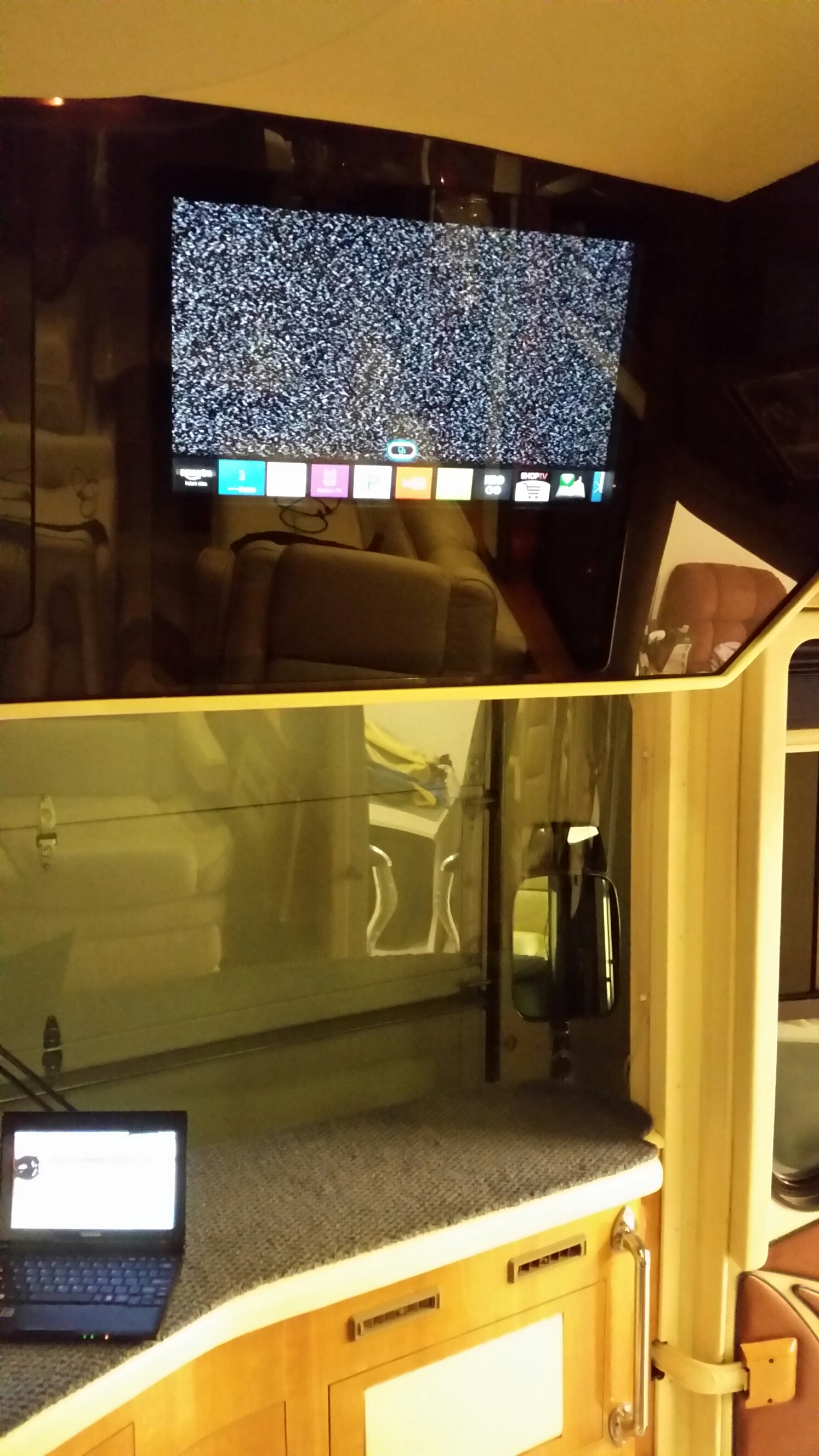 I’ve been thinking about upgrading my salon and bedroom TV(s) for a while now but I didn’t want to hang a big oversized flat screen on the interior of my bus. I already have a 42” HD flat screen in my second curbside bay. Further, I wanted to utilize the compartments that housed the original ProScan 21” CRT type TV(s) that BB installed when the bus was new. The trick was to find the largest snug fitting ones that would fit in the existing compartments. After much measuring and searching, I found the (2) Samsung 24” Smart LED TV(s) that just fit perfectly on Amazon. They are model # UN24H4500. The additional 3” in the screen size is proportionally perfect and fits the size of the rooms nicely.