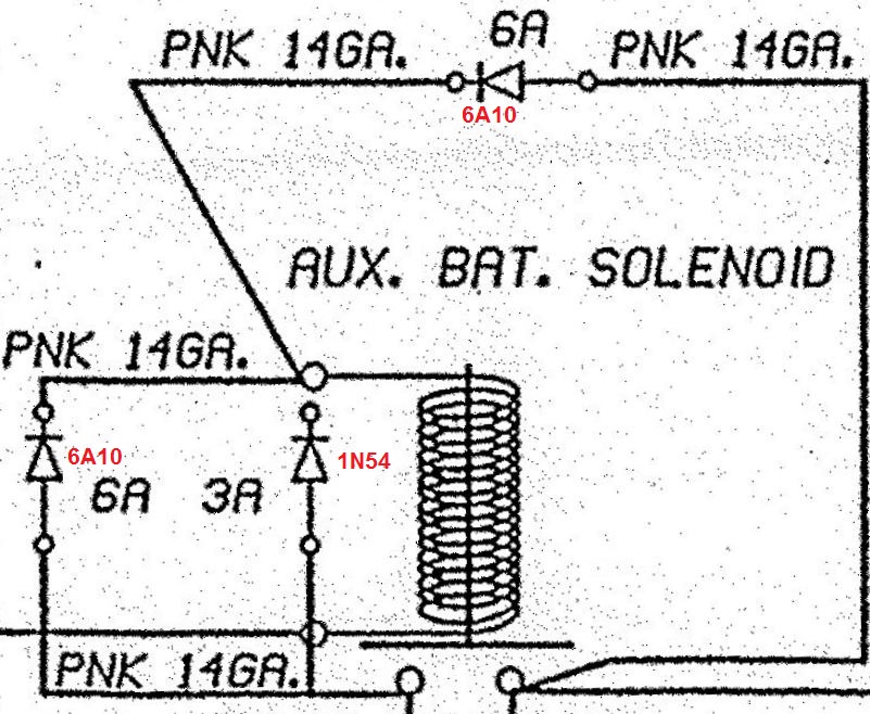Here's what the diode configuration around the 'Aux Batt' solenoid should look like. I penciled in the diode part numbers in red: You should be running a Delco Remy voltage regulator part number: 19020413. I see now that this part number has been superseded by: 10503807 Here's a Delco Remy document, from our Document Library, on retrofitting the 10503807 Voltage Regulator: Delco Remy 50DN Voltage Regulator. Here's a document from our Document Library that shows how to test the Alternator: Series-60 50DN alternator test. Here's a document from Blue Bird (also in our Document Library) that suggests a modification to the voltage regulator wiring: Voltage Regulator Wiring Modification. The new voltage regulator, 10503807, is five wire: Field, Ground, Battery, Ignition, and Sense. The relay in this document is no longer necessary since there is a relay built-in to the voltage regulator for the VR's Ignition terminal. Notice how this document suggests moving the Sense/Battery wire from the chassis battery bank to the coach (house) battery bank. George Morris (Ex Blue Bird employee and Wanderlodge expert extraordinaire) suggests that the Battery and Sense leads be connected to the first insulated stud on the aluminum heat shield where the alternator output connects directly. It's best that this connection be made thru a fuse or a 15A circuit breaker. For better or for worse the 'Aux Batt' solenoid is the original Wanderlodge configuration interfacing the chassis and house battery banks. Someday it'd be fun to review this setup and to possibly isolate the banks better with Battery Isolators, or similar technology. A Battery Isolator will allow the Xantrex chargers or the 50DN alternator to charge both banks but it won't allow one depleted bank to discharge the other bank. There's definitely room for improvement over the original design using standard and available technology. david brady, '02 Wanderlodge LXi 'Smokey' (Sold), '04 Prevost H3 Vantare 'SpongeBob' "I don't like being wrong, but I really hate being right" |